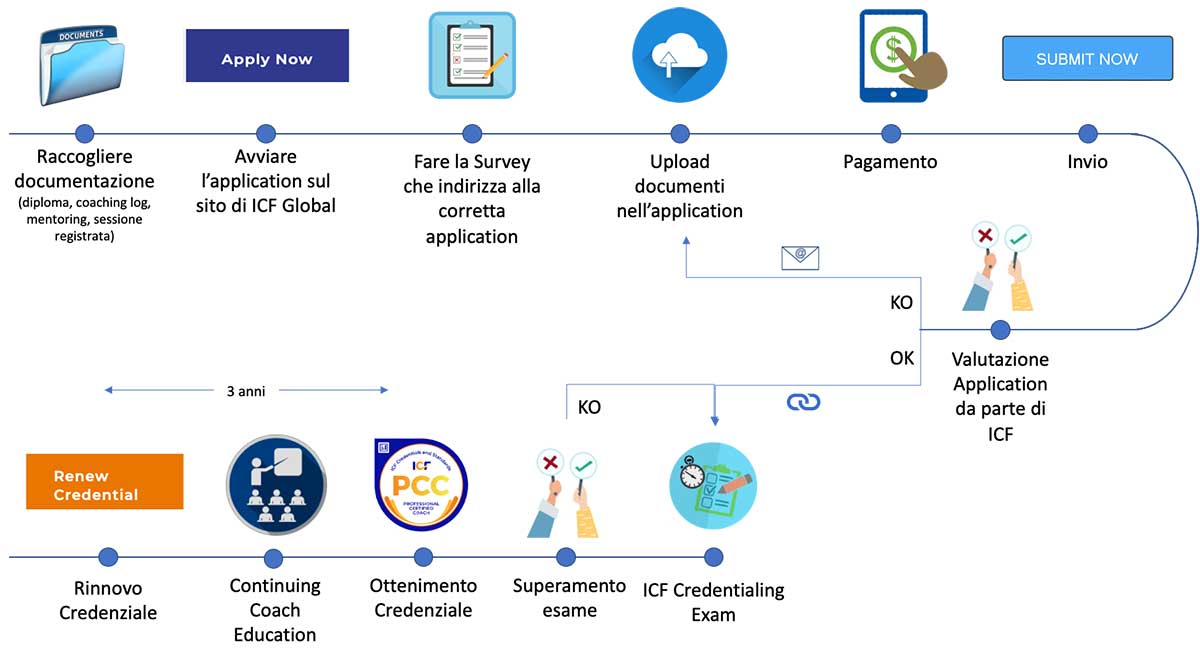 Una volta che hai tutto ciò che serve (formazione, esperienza, mentoring, sessioni registrate e trascritte) puoi collegarti al sito di ICF Global a questo link (richiedi credenziale) e iniziare la procedura per la richiesta della credenziale!